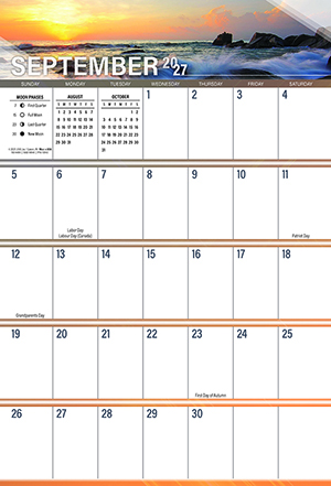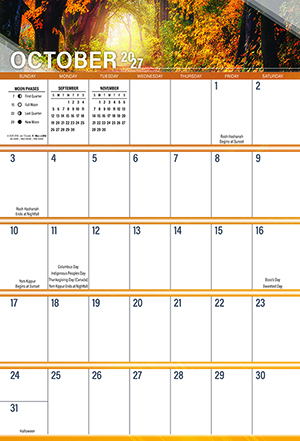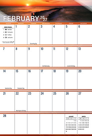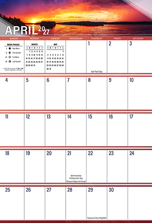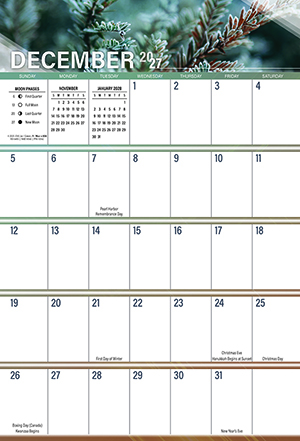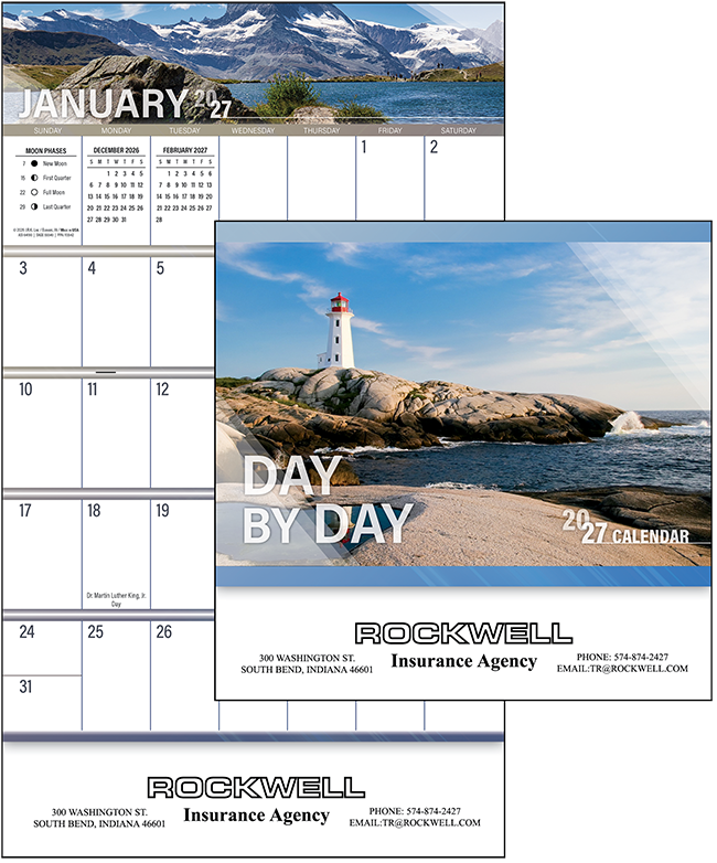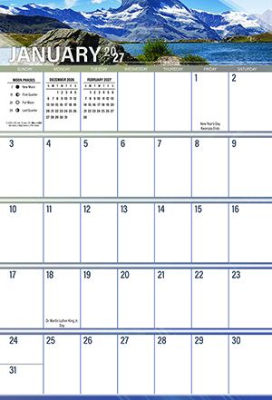 The Day By Day is a general calendar featuring scenic photographs for each month, as well as extra-large daily boxes (1 1/2″ x 2 3/8″) for noting appointments.